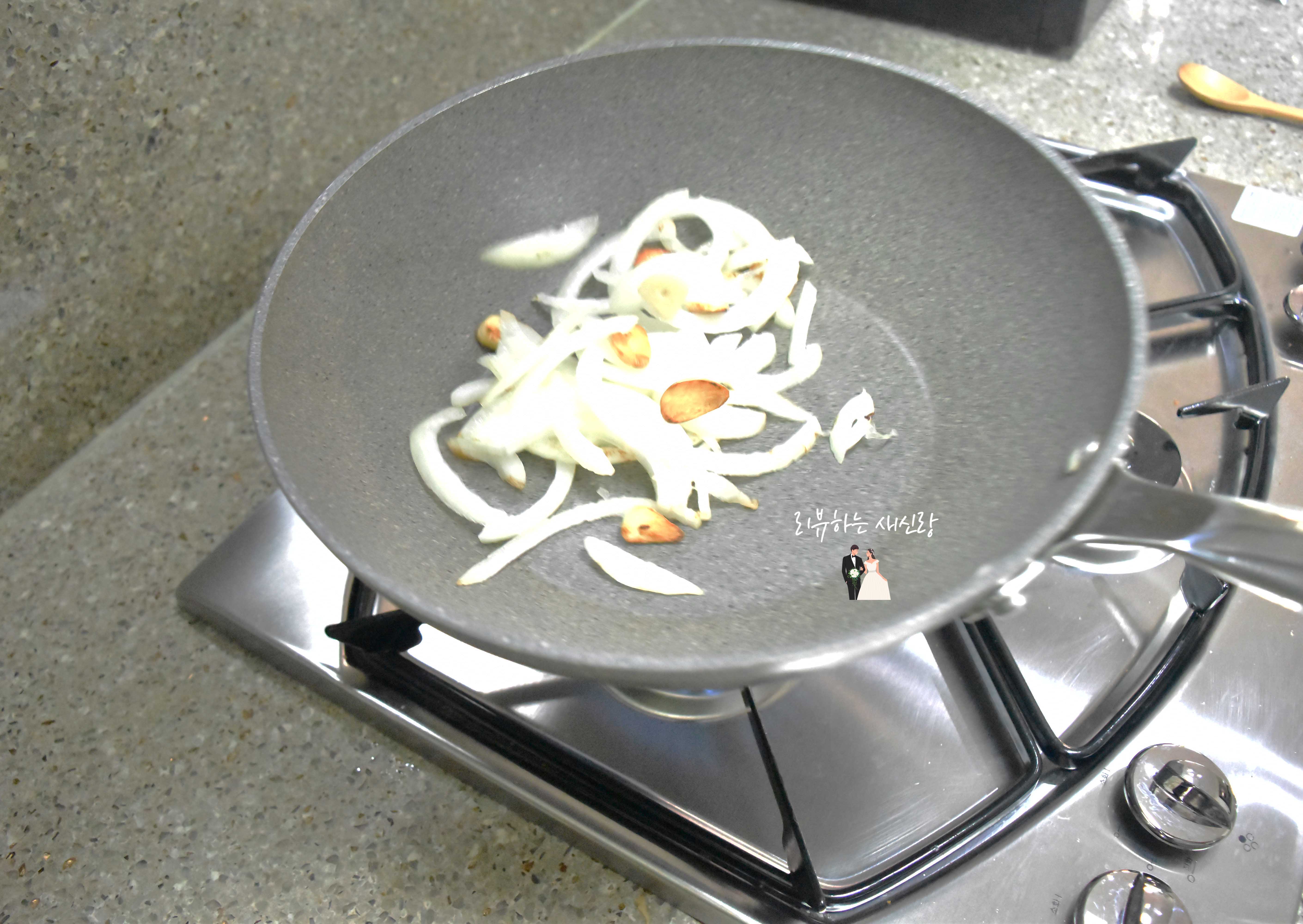 프라이팬은 이렇게 살짝 웍 형식으로 된 것이 좋답니다. 그러나 없어도 상관없어요~! 사진을 찍으면서 짬뽕 느낌이 나도록 재주를 좀 부려보았는데요. 생동감이 전해지시나요? 양파는 사진과 같이 세로로 길게 썰어주세요. 길게 썰면, 면과 함께 먹을 때 재료가 입에서 따로 놀지 않아 좋습니다. 불은 계속 중불로 맞춰주시고, 이어서 바로 해산물을 넣어줄 거예요. 해산물은 집에 있는 작은 오징어 등 갑각류 해산물 다 좋아요.
