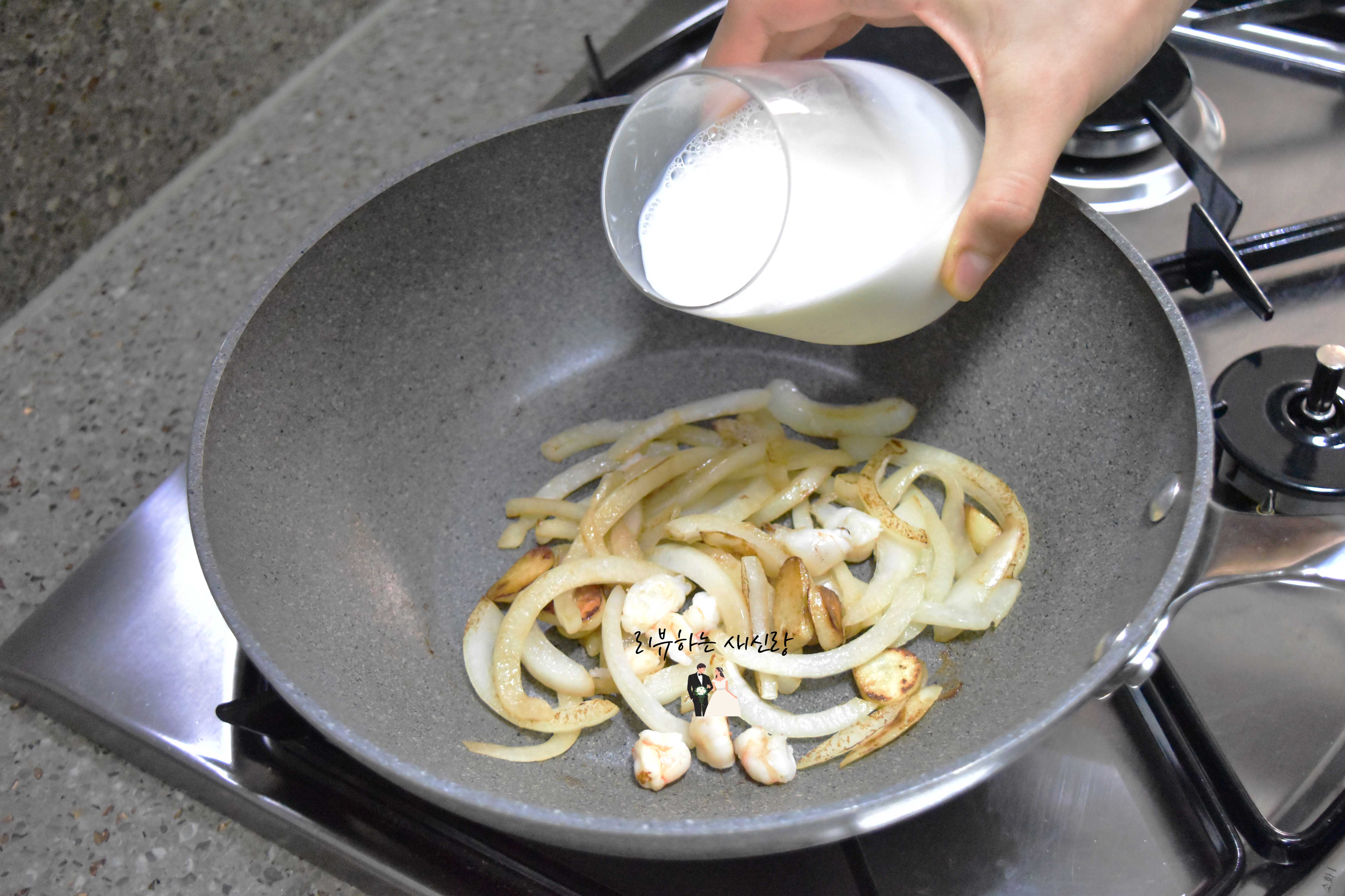 우유는 200ml 정도 넣어줄 거에요. 물과 우유는 2:1로 넣어주신다고 생각하시면 됩니다. 새우가 어느 정도 재료와 어우러져 익었을 때 (붉은 기) 우유를 넣어주시고 이어서 물을 100ml가량 넣어주세요. 우유는 종이컵 2컵 정도, 물은 1컵 정도라고 생각하면 계량컵 없을 경우 가정해보실 수 있어요.