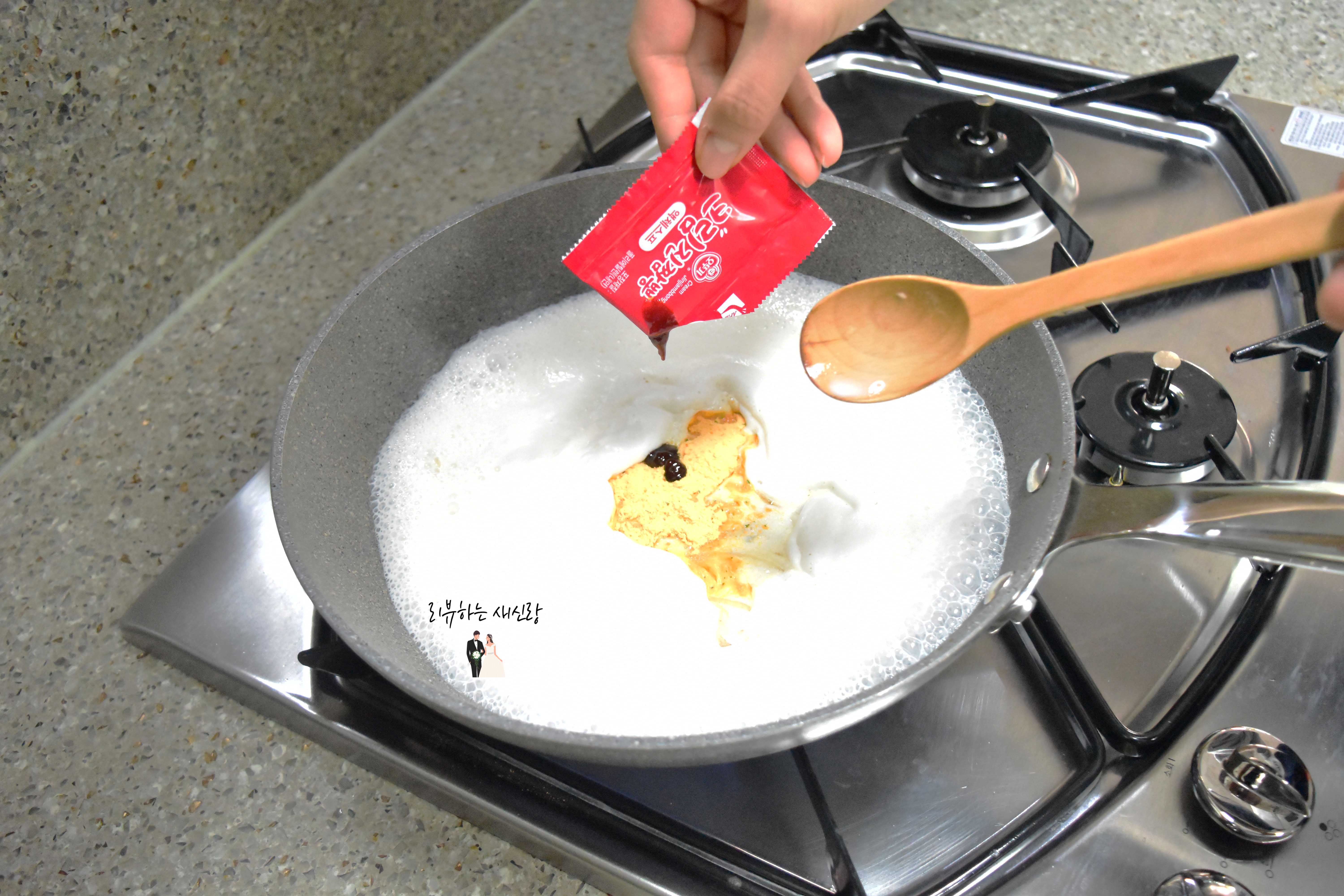 냄비가 작으면 우유를 넣으셨을 때, 거품으로 넘칠 수도 있는데요. 그럴 땐 불을 안 넘칠 만큼 줄여주세요. 저와 같이 넓은 팬을 사용하면 더 좋습니다. 소스는 주황빛이 돌아서 마치 로제 파스타 느낌이 나는데요. 마치 어느 요리에 들어가도 다 잘 어울릴 것 같은 느낌이 물씬 났습니다. 액상스프는 다 넣지 마시고, 절반 정도만 넣으시는 걸 추천드려요.