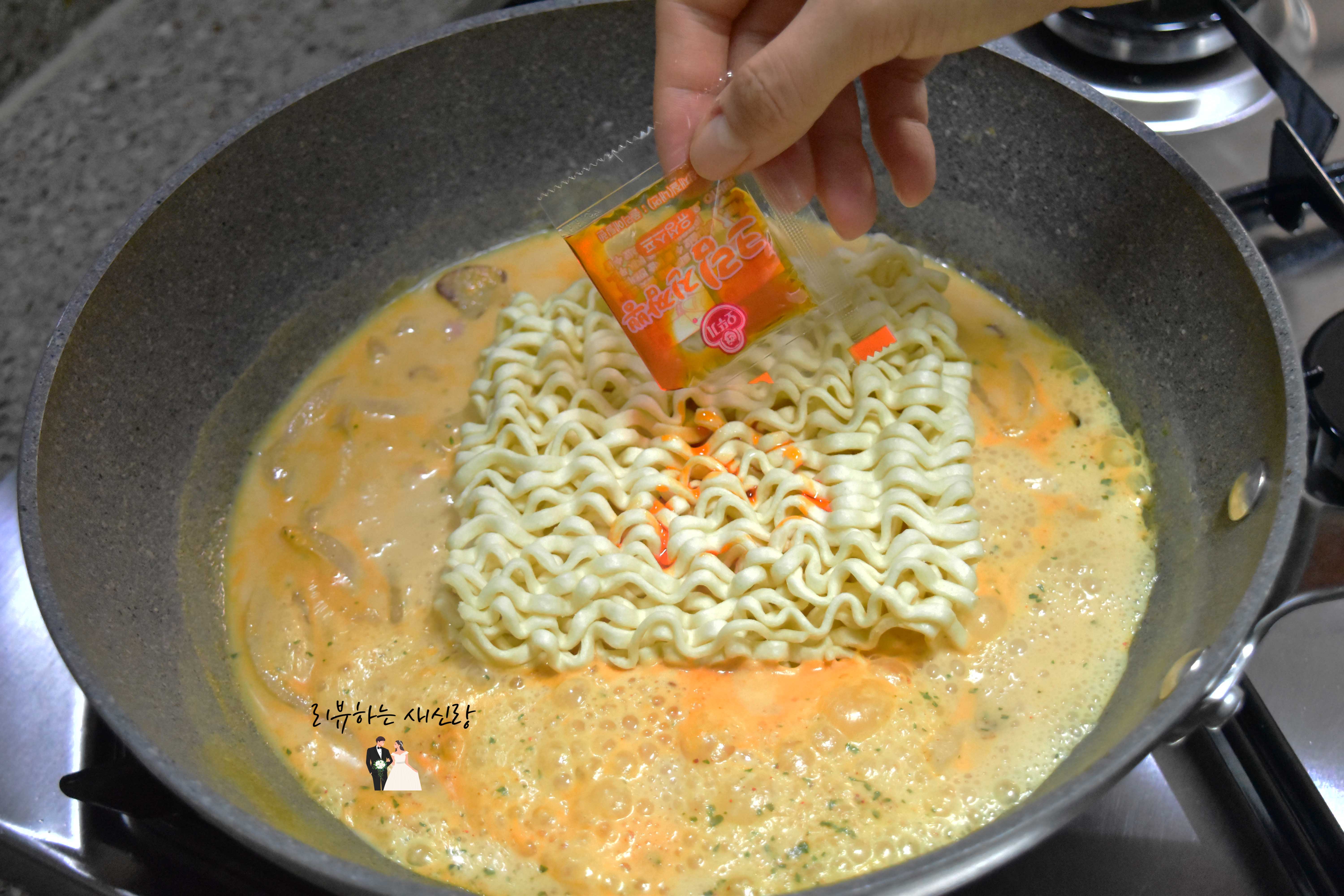 이제 사실 거의 50%는 다 끝났습니다. 라면이어서 정말이지 간단해야 나중에도 또 해먹을 생각을 할 수 있는 것 같더라구요. 면이 익은 것을 체에 거르고 식히고 이런 과정들도 물론 하면 좋겠지만, 저는 간단하면서도 더욱 맛이 있는 방법으로 진행해 보았습니다.