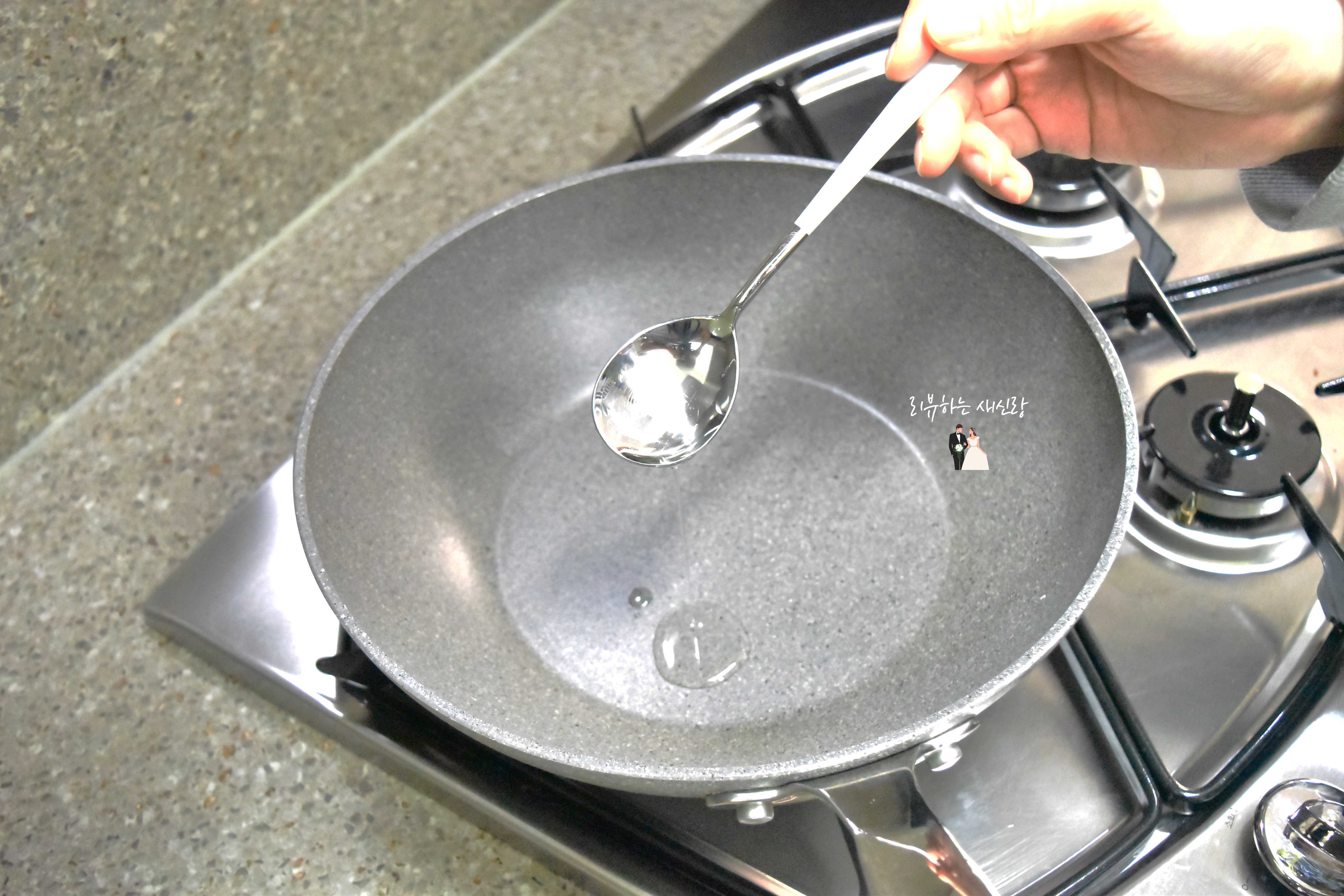 이렇게 기름 한 스푼을 넣었으면, 불을 강하게 해서 프라이팬이 충분히 달궈지도록 해주세요. 한 30초 정도 기름이 후라이팬 전체로 둘러지도록만 해주시면 됩니다. 그리고 불을 중불로 줄여주세요.