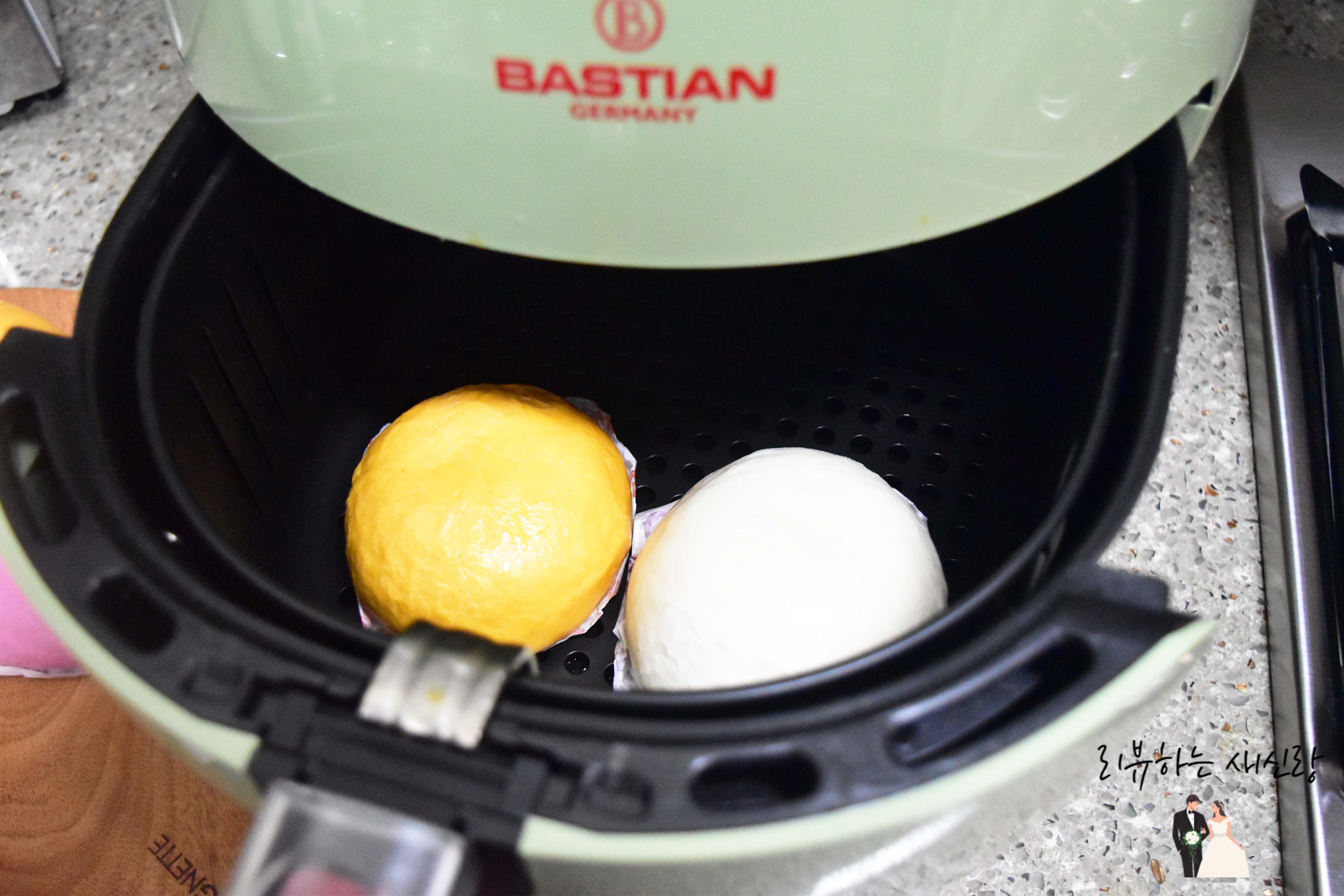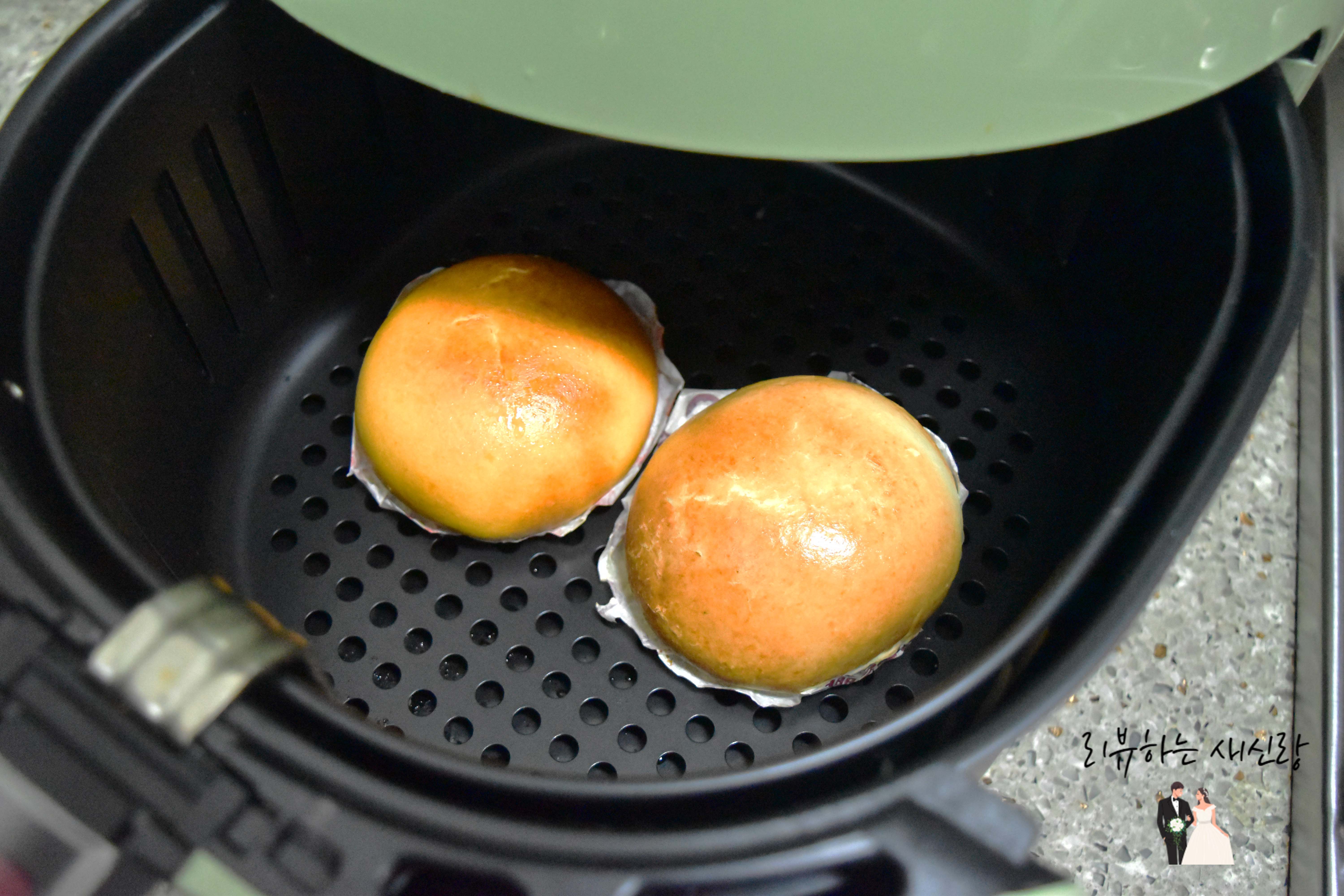 160도로 예열된 에어프라이어, 딱 10분간 두피 케어를 받은 호빵들을 에어프라이어에 입장시킵니다. 온도가 너무 높거나, 시간이 너무 길면 기름을 발랐기 때문에 탈 수 있으니 딱 10분만 돌려주세요. 혹시 냉동 상태로 해동이 안되었다면, 전자레인지에 30초~40초 돌린 후, 위와 같은 과정을 진행해주시면 됩니다.