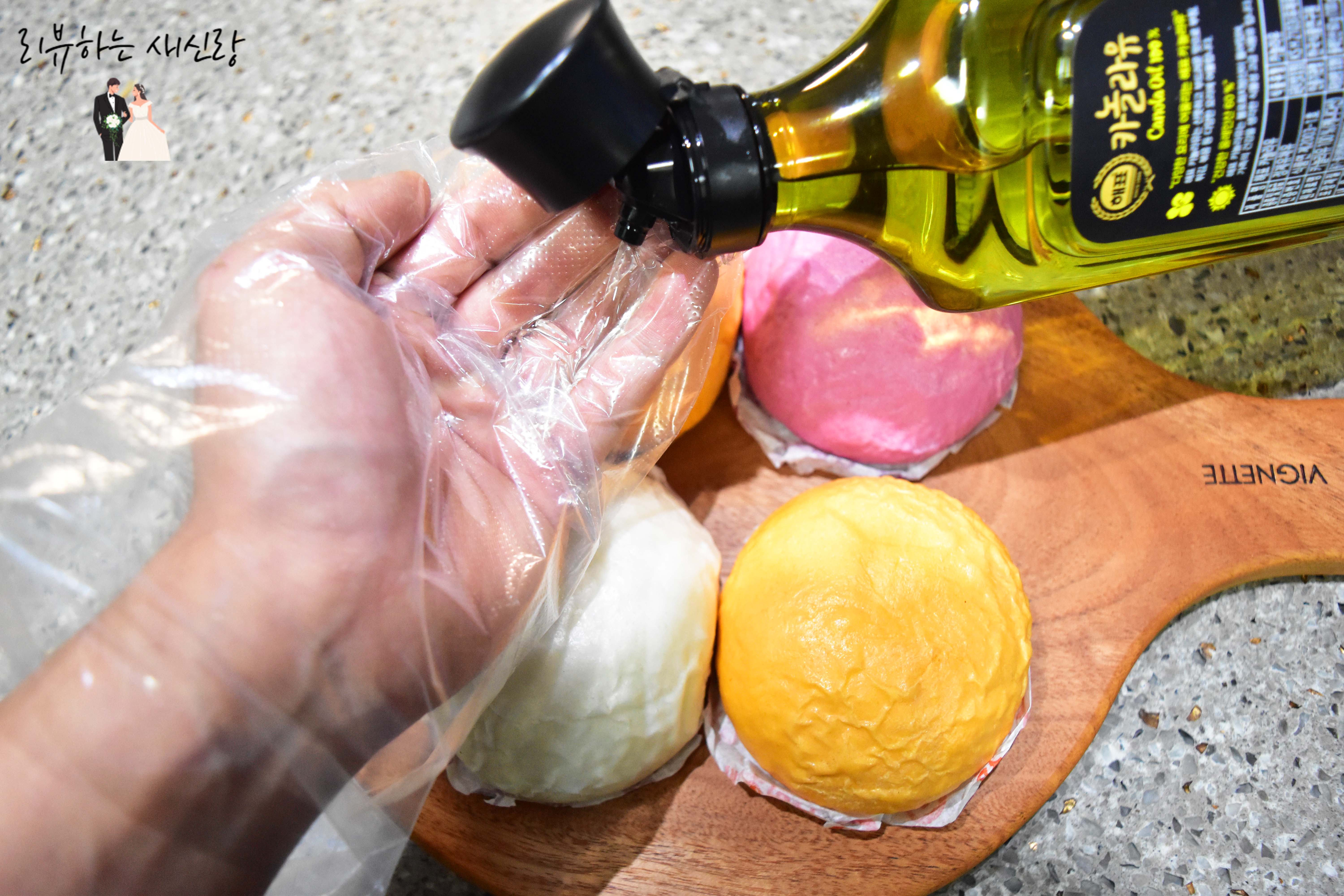다음, 호빵에 겉면에 식용유를 발라주셔야 합니다. 카놀라유, 해바라기씨유, 올리브유 등 모두 다 좋습니다. 그러나 참기름이나 들기름처럼 향이 진한 기름은 추천드리지 않습니다. 왜냐면, 호빵 고유의 맛을 뺏어갈 수 있기 때문입니다. 또 너무 기름을 듬뿍 바르면, 호빵이 너무 기~름져지니까, 정말 겉에 살짝 입혀준다는 생각으로 발라주세요.